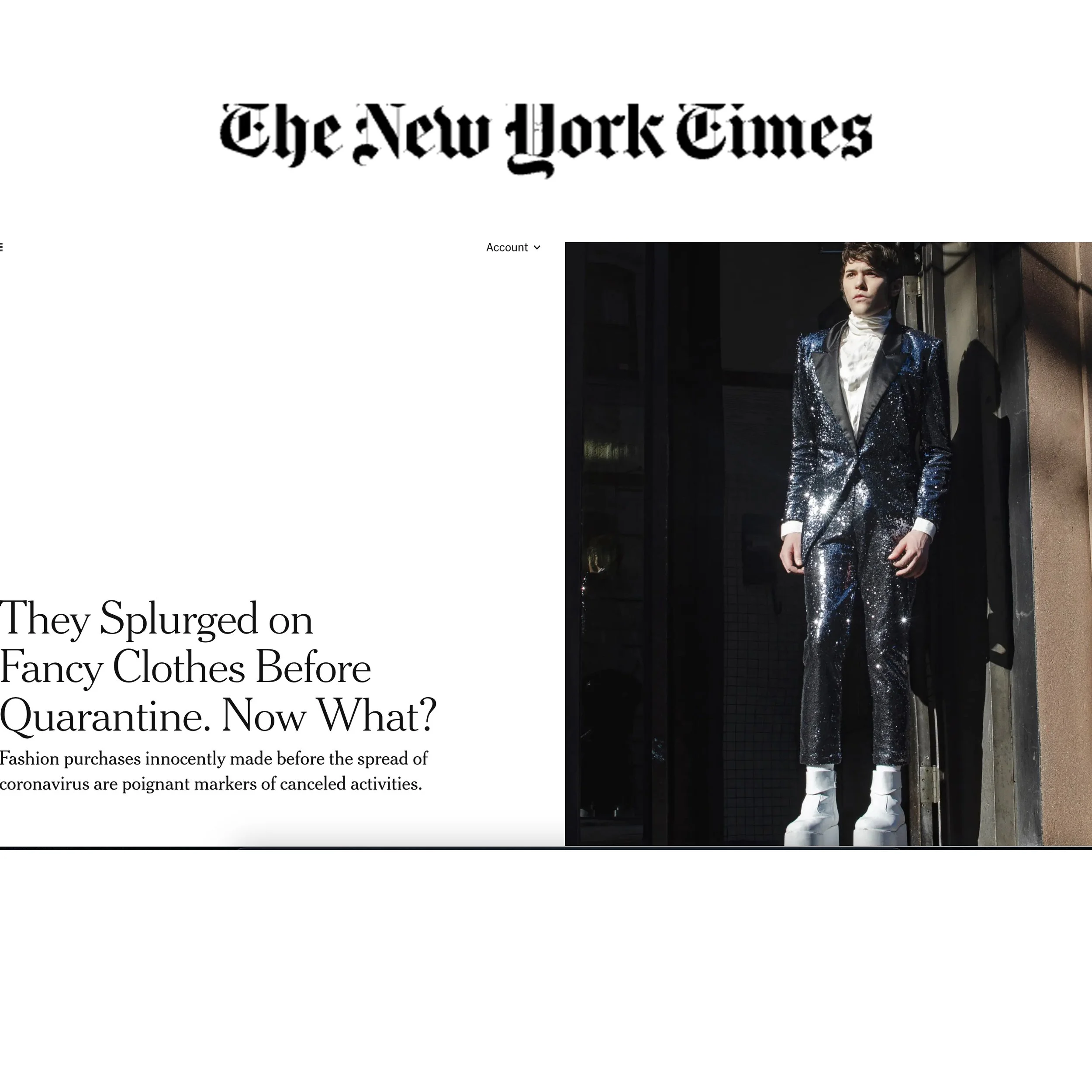 During one of the largest shifts in our recent history, I was able to shoot photos of musician Mike Greko for the New York Times’ style section featuring fashionistas that splurged on clothing right before the pandemic quarantine to document how they were coping with the circumstances.