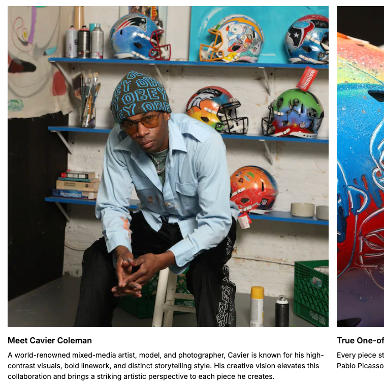 Visual artist Cavier Coleman (@cavierart) in his Brooklyn studio with featured NFL Fanatics 1-of-1 painted helmets